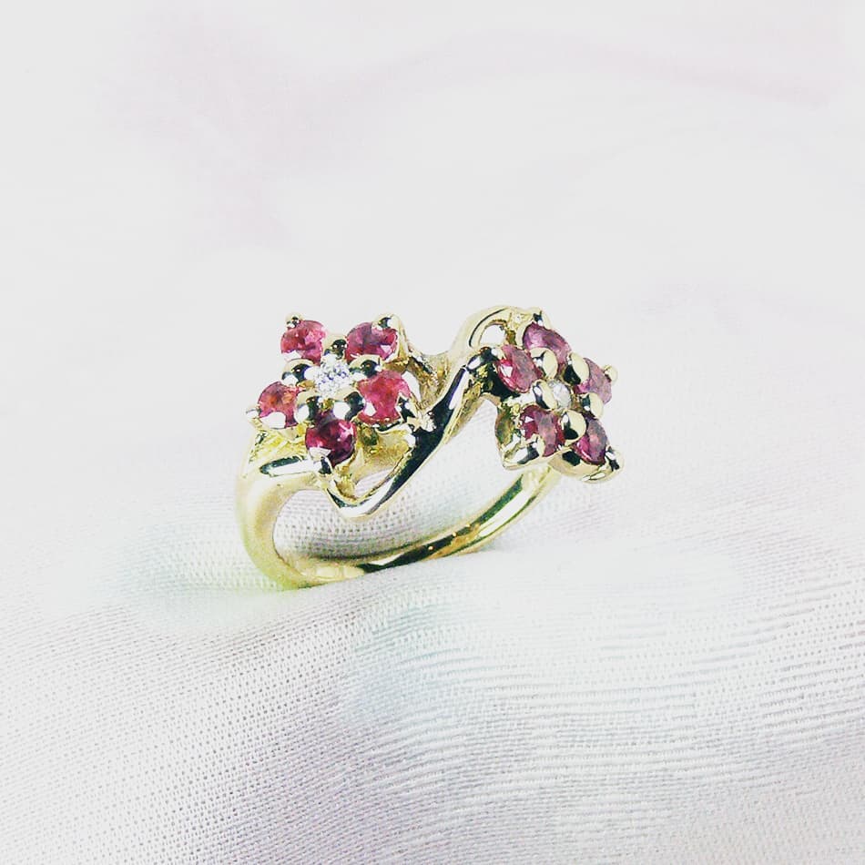 実はちょっとした遊び心で右の梅の花は上のお子さん(小学生)を表していて一粒だけ他よりグレードの高いルビーを使っています。お子さんの10歳づつの成長ごとにグレードの高いルビーに一つづつ変えていくのもいいんじゃないですかね(笑)